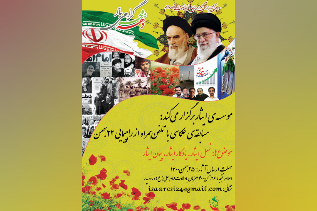 به گزارش روابطعمومی موسسه فرهنگی، ورزشی و توانبخشی ایثار، ۱۷بهمن۱۴۰۰، به مناسبت چهل و سومین سالگرد پیروزی انقلاب اسلامی ایران، مسابقهی عکاسی با تلفنهمراه در راهپیمایی ۲۲بهمن، توسط واحد روابطعمومی ایثار برگزار میشود. علاقمندان میتوانند شرایط و نحوهی شرکت را در پوستر این مسابقه مشاهده کنند./انتهای پیام